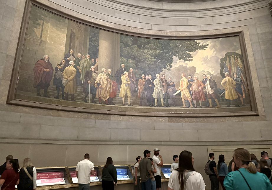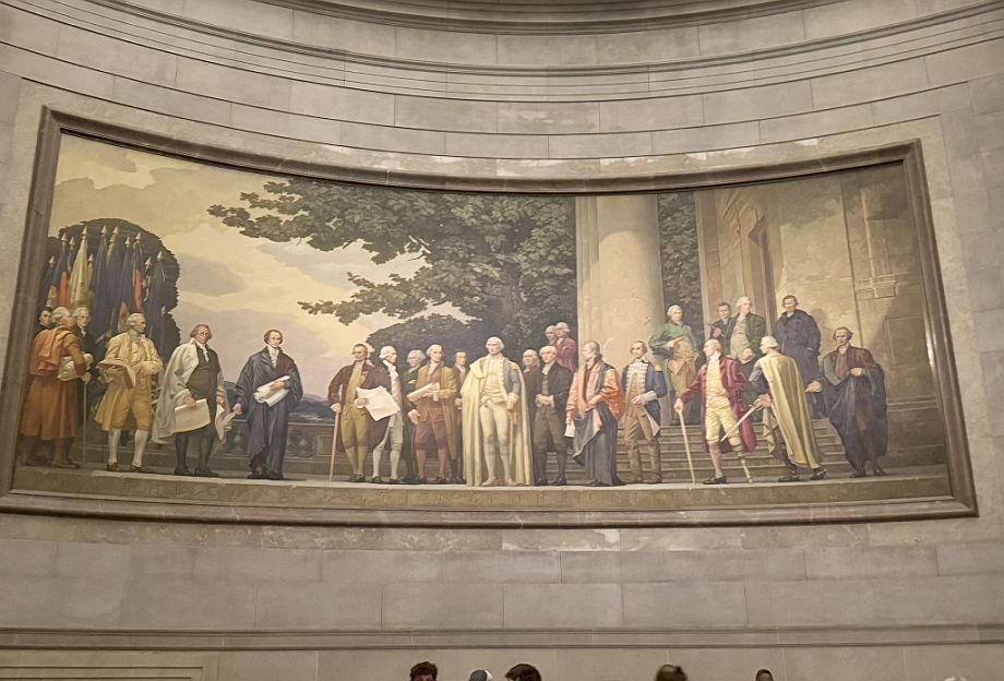 There are two monumental murals that adorn the curved walls of the Rotunda. These are among the largest paintings ever created in the United States and were commissioned specifically for the National Archives building. This one is "The Constitution of the United States" by Barry Faulkner (on the west wall). This mural illustrates the crucial moment on September 17, 1787, when the Constitutional Convention in Philadelphia completed its work and presented the newly drafted United States Constitution for signing. George Washington, who presided over the Convention, stands central, symbolically offering the document to the assembled delegates.