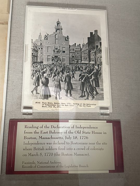 On the right is a fascinating historical depiction often associated with the Declaration. This picture commemorates a significant public event: the first public reading of the Declaration of Independence in Boston. This took place on July 18, 1776, two weeks after its adoption in Philadelphia. The Old State House in Boston was a central location for political activity during the colonial period and the American Revolution. The balcony served as a public forum from which important announcements were made to the citizens gathered below in what is now State Street.