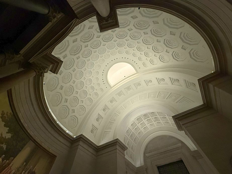 When you stand in the Rotunda and look up, the dome is meant to make you pause. It was intentionally designed to feel solemn, almost sacred. like a civic cathedral. The building was designed by John Russell Pope, who also designed the Jefferson Memorial. He loved classical architecture, and the dome reflects that influence. The Rotunda rises about 70 feet high, t is circular, symbolizing unity and continuity. The coffered ceiling (recessed square panels) creates depth and rhythm, Natural light was originally part of the design, though today lighting is carefully controlled to protect the documents. The dome’s proportions echo Roman and Renaissance civic spaces, suggesting permanence, democracy, and balance.