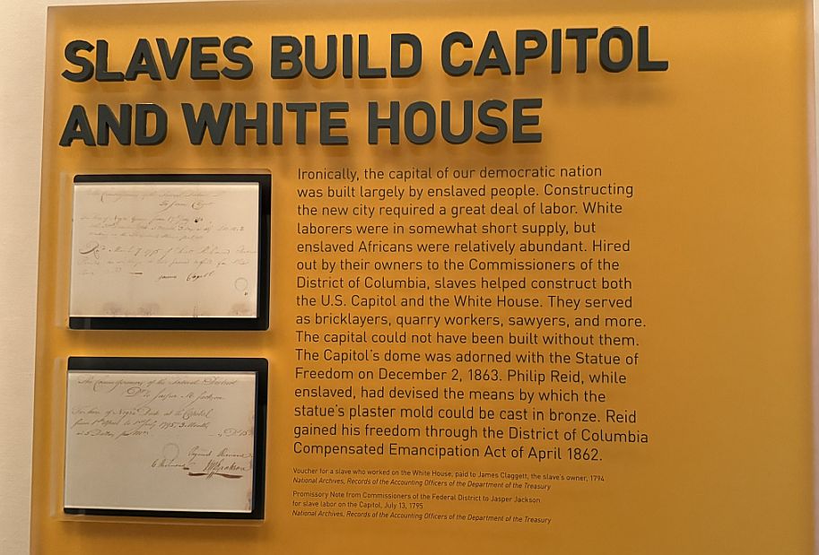 "Slaves Build Capitol and White House, Slaves Records": This section confronts the painful truth of American history regarding slavery.