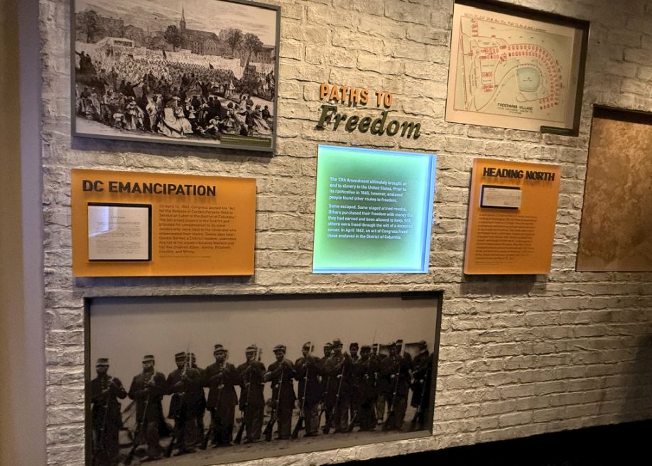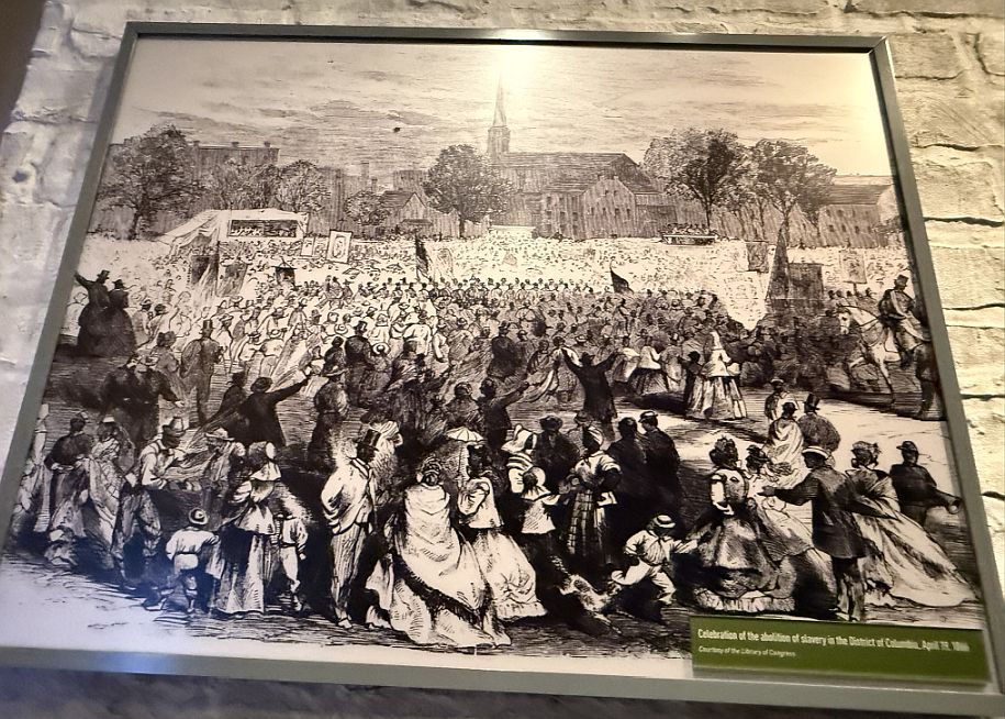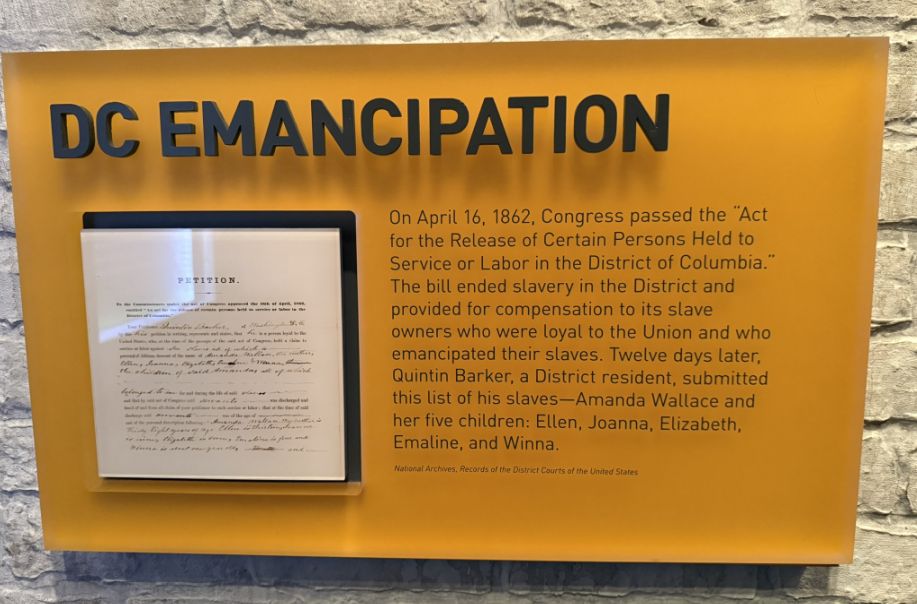 "D.C. Emancipation": This refers to the Compensated Emancipation Act of 1862, which freed enslaved people in the District of Columbia on April 16, 1862, making D.C. the first jurisdiction in the United States to abolish slavery. While the Emancipation Proclamation (effective January 1, 1863) eventually freed slaves in Confederate states, D.C.'s emancipation preceded it. This exhibit highlights the local fight for freedom.
