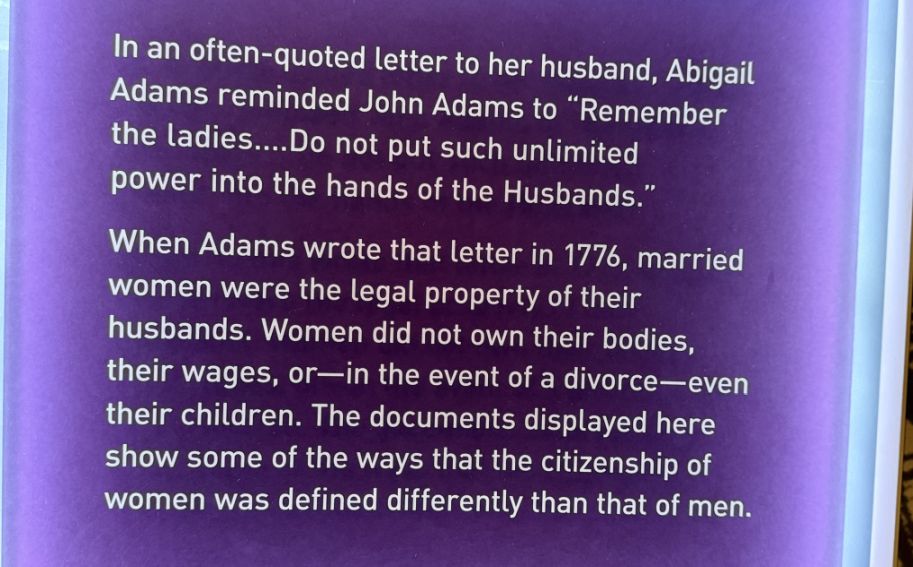 "Remember the Ladies" Panel: This refers to a famous letter written by Abigail Adams to her husband John Adams (who was attending the Continental Congress) in March 1776. In this letter, she urged him to "Remember the Ladies" and to be more generous and favorable to them than their ancestors had been when drafting the new laws for the independent nation. It's an early and articulate plea for women's rights and inclusion in the new republic. This panel signifies the long fight for women's suffrage, property rights, and equal legal standing.