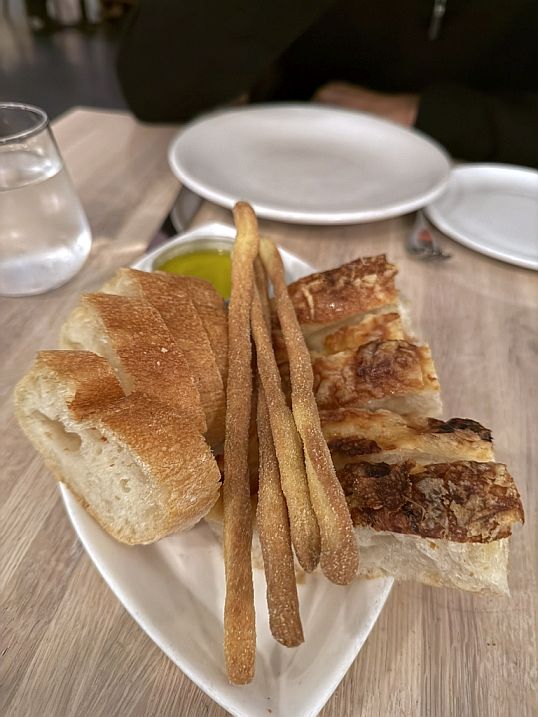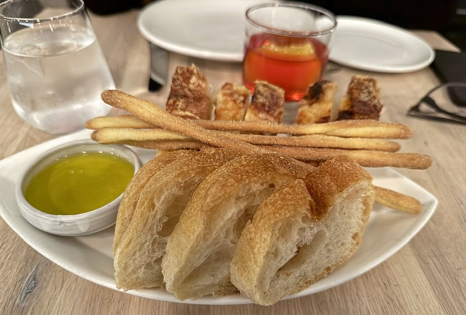 Selection of homemade piccolina bread, with extra virgin olive oil. This is deceptively simple but foundational to Italian dining.