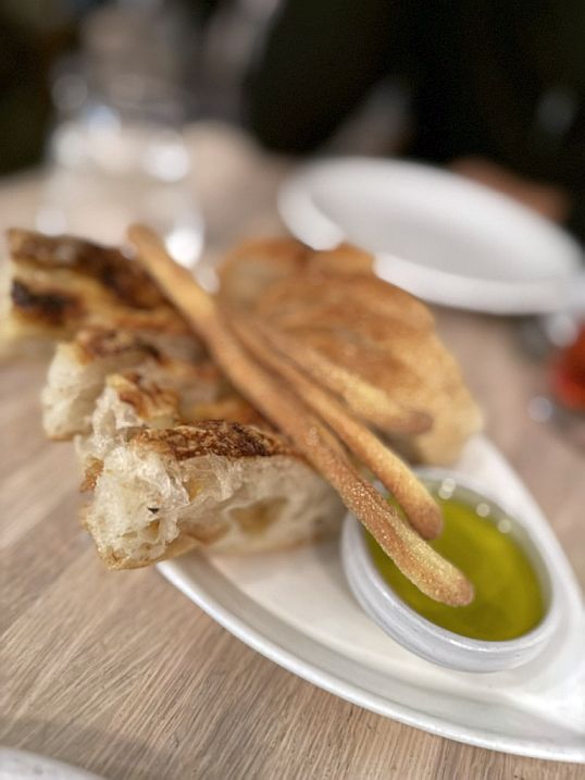 Piccolina breads are small, house-made breads with varied textures, often airy interiors with crisp crusts. Served with high-quality extra virgin olive oil, meant for dipping rather than butter.
