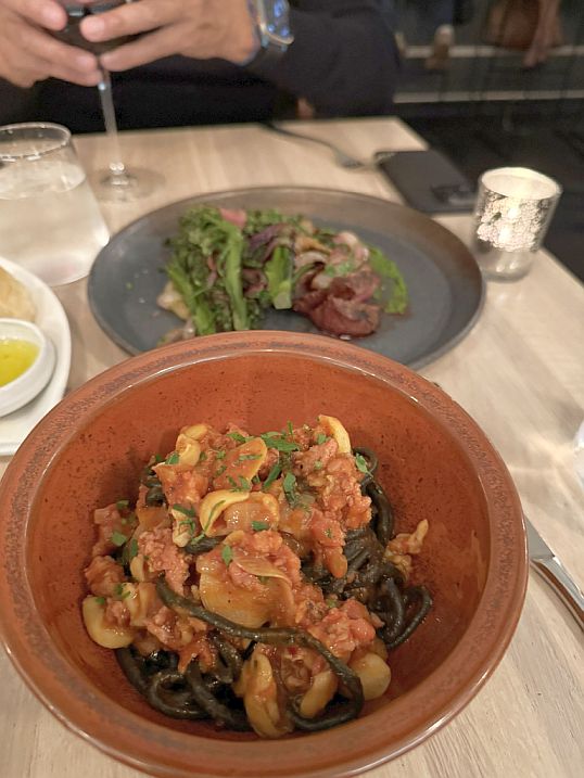 The lively restaurant welcomed us with a bustling bar and an open kitchen that set an energetic tone for the evening. We began with a Negroni and shared homemade piccolina bread with olive oil and blistered shishito peppers with bagna cauda, followed by a rich squid-ink bucatini with cuttlefish and fennel sausage and a beautifully prepared Iberico pork shoulder with charred broccoletti and salsa verde. Dessert was the Amata, Centrolina’s refined interpretation of tiramisu with pistachio cake, matcha, mascarpone, and honey, a light and elegant ending to a memorable meal. We truly loved this restaurant and were very glad we chose to come here.