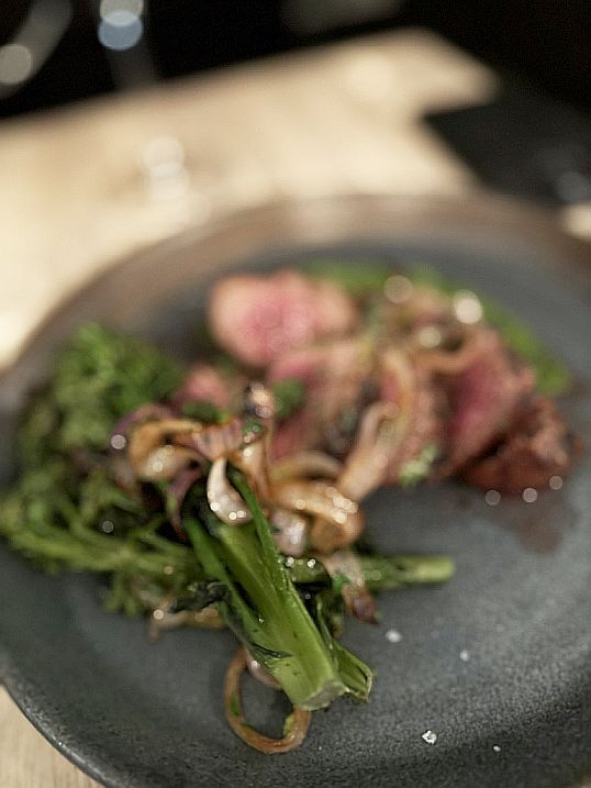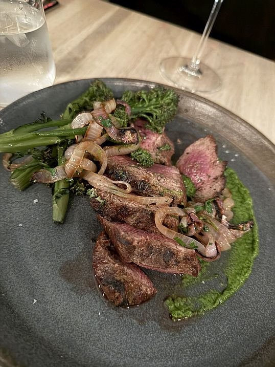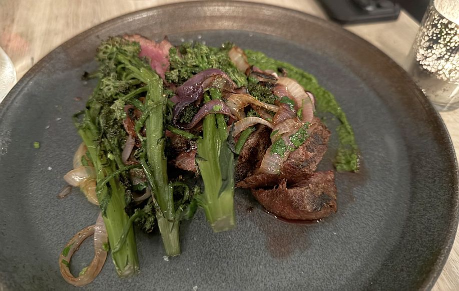 Miale Iberico Presa Pork Shoulder Steak, charred purple broccoletti, sweet red onion, salsa verde.