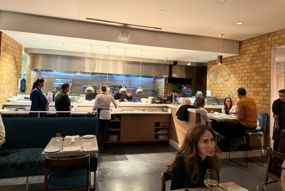 At the far end, the open kitchen becomes the focal point, where you can see chefs working continuously, rolling pasta, plating dishes, coordinating orders. Stainless steel, bright lighting, and visible motion create a sense of precision and energy.