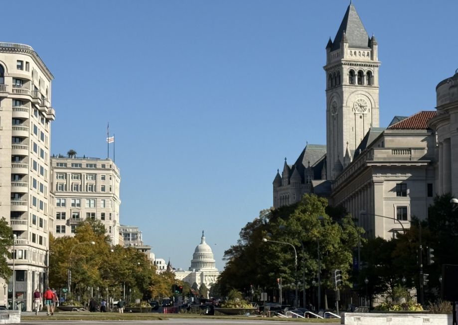 We are now walking on Pennsylvania Avenue NW, the city reasserts itself with a vibrant hum. The avenue itself is steeped in history, a ceremonial artery connecting the White House to the Capitol, lined with federal buildings and monuments. Looking eastward down this grand boulevard, past the everyday bustle of traffic and pedestrians, our gaze is drawn to a quintessential American icon: the majestic U.S. Capitol Building. Even from a distance, with other structures perhaps obscuring its lower levels, the dome of the Capitol rises above the urban skyline, a radiant symbol against the backdrop of the sky.