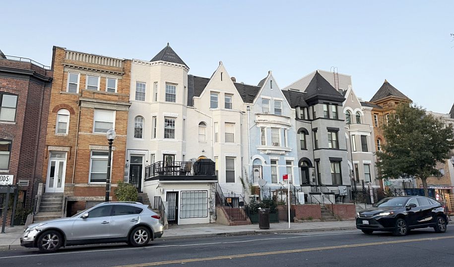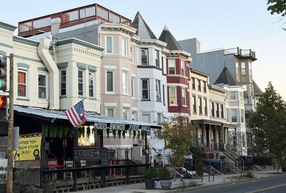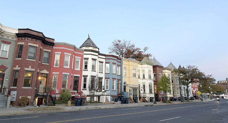 The use of bright colors contributes to a lively and distinctive neighborhood character, making these streets feel more intimate and less uniform than some of the grander, more monochromatic avenues elsewhere in D.C.