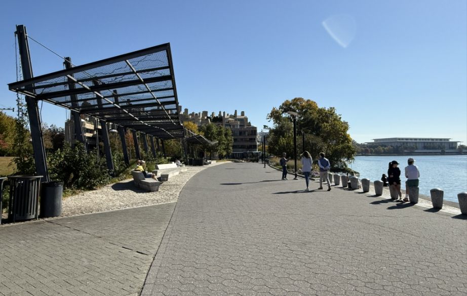 The harbor sits along the Potomac River, where Washington’s historic port once handled tobacco trade and goods arriving from overseas. Today, the area has been transformed into a welcoming waterfront park and promenade. The boardwalk curves gently along the river, lined with restaurants, outdoor seating, and wide walking paths where locals jog, stroll, or simply sit facing the water. The open design lets the sky and river dominate the scene, giving a relaxed, almost coastal atmosphere.