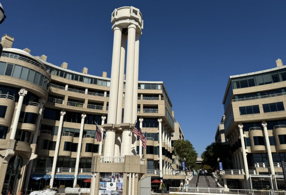 This is the main square before accessing the harbor. The tall white tower is the Washington Harbour.