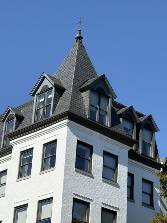 A row of Victorian rowhouse with pointed roofs. The 4-story colorful buildings are typically Victorian-era rowhouses, many built in the late 1800s when Georgetown was expanding and architectural tastes became more decorative and expressive.