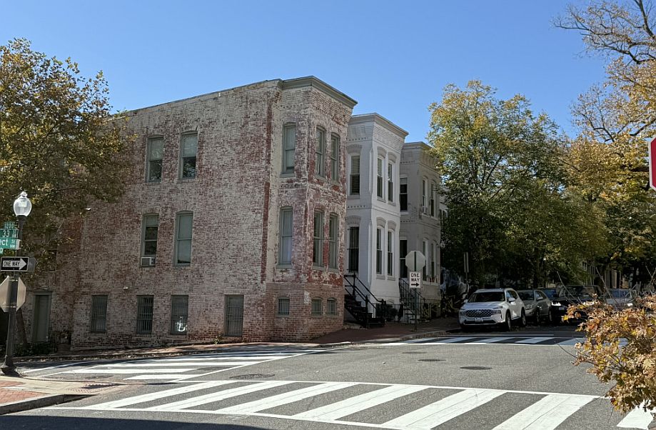 We are now at one of the most picturesque intersections in Georgetown, where Prospect Street climbs slightly above M Street and the architecture becomes more residential and historic in character. The mix of a brick building, a white building, and a gray building perfectly shows how Georgetown evolved over different periods while keeping a cohesive look. The brick structure is likely a Federal- or early Victorian-era townhouse or commercial house dating from the early–mid 1800s. Georgetown’s red brick was locally made and durable, which is why so many original buildings survive.