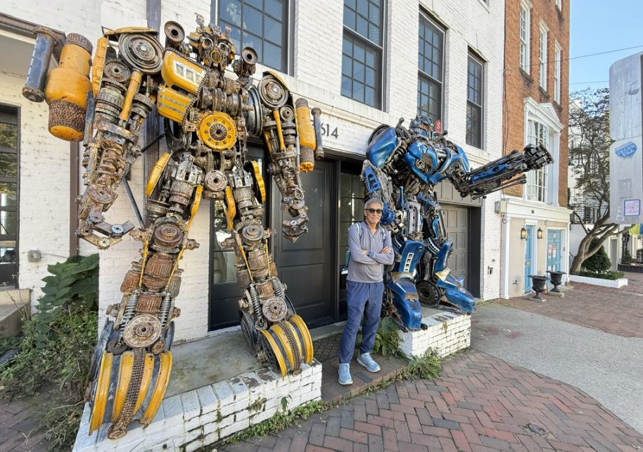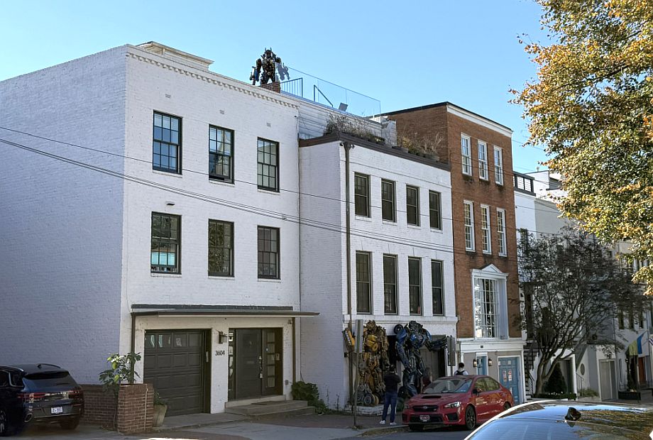 The building is known as the Georgetown Robot House, a private residence that became locally famous because of the large robot sculptures installed outside and on the roof. The colorful robots, two at street level and one perched above were created by the homeowner, an artist and designer who wanted to add a playful, futuristic contrast to Georgetown’s historic streetscape. Because this home sits inside the Georgetown Historic District, any exterior changes visible from the street must be approved by preservation authorities. Georgetown has strict rules intended to protect its 18th- and 19th-century character, materials, colors, additions, and even decorations can be regulated. City preservation officials have argued that the robots alter the historic appearance of the neighborhood, and rooftop installations are especially sensitive because they affect skyline views,