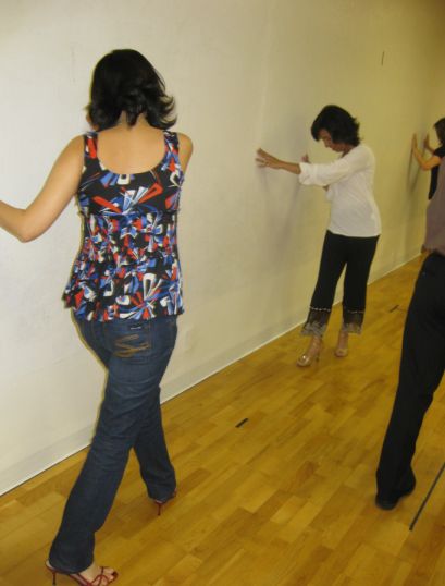 While the guys are learning their steps, the ladies are using the wall so we can lean on it without loosing our balance.