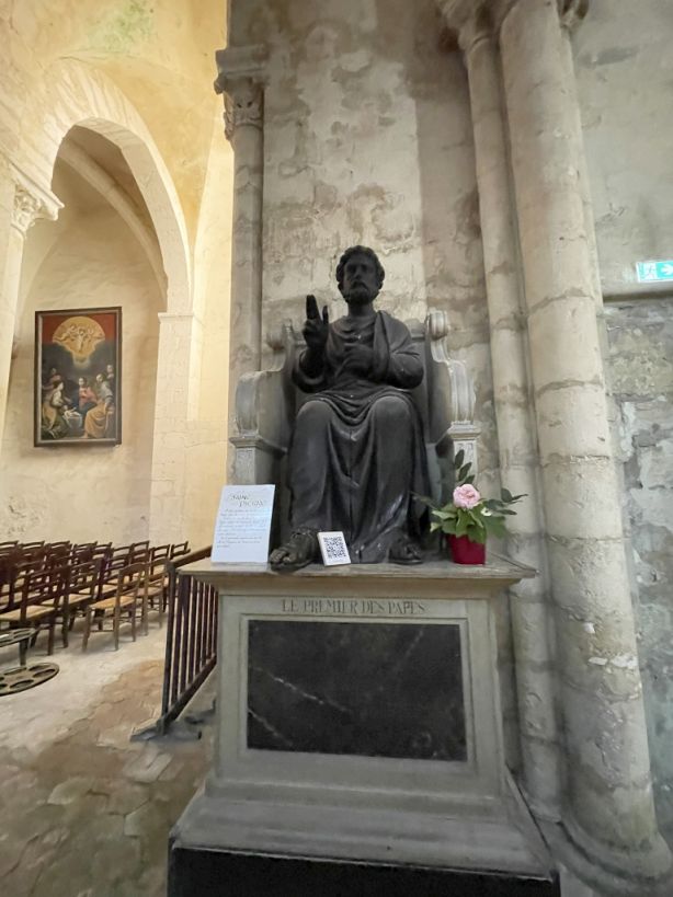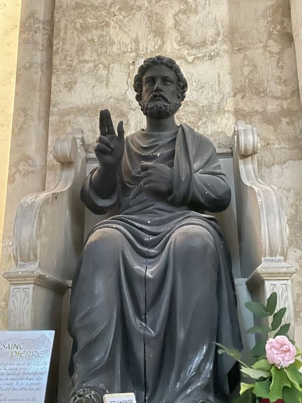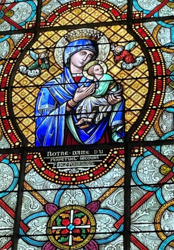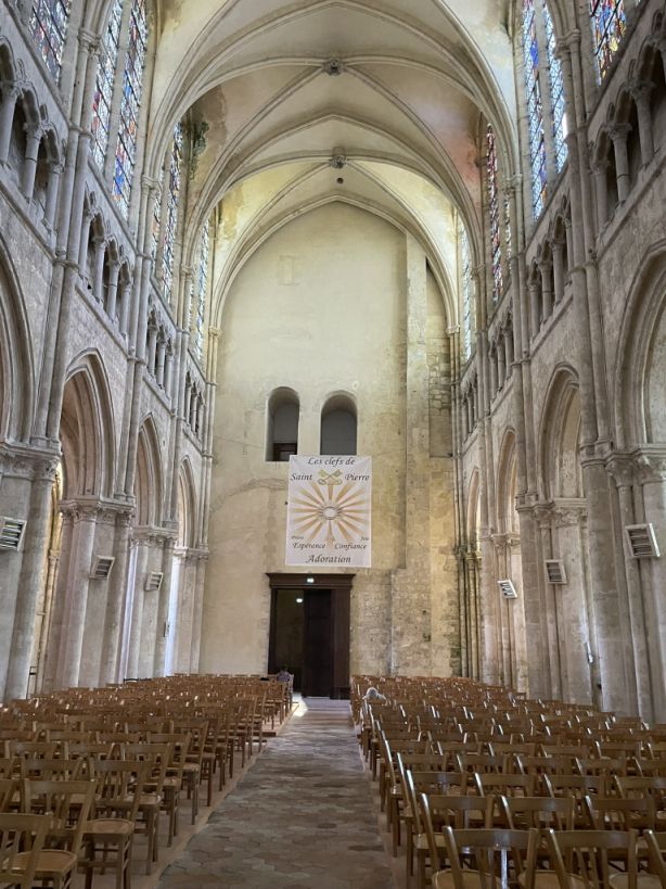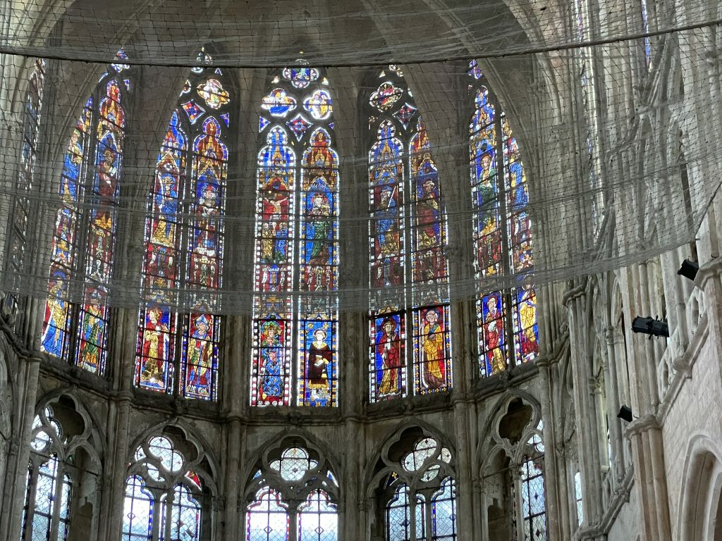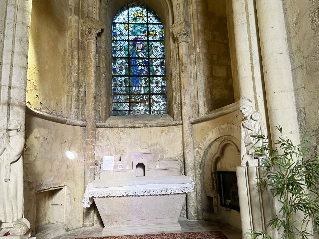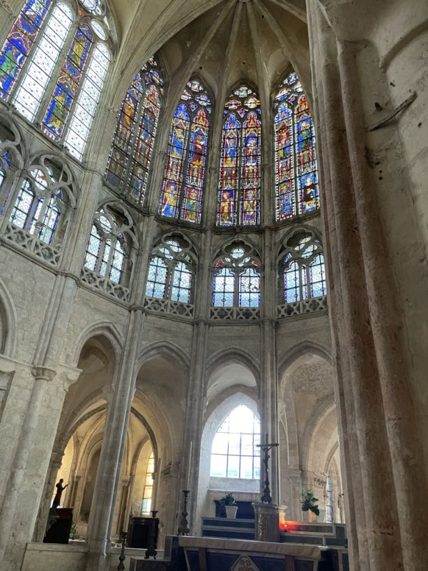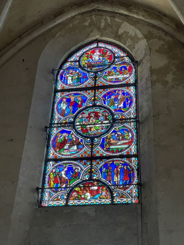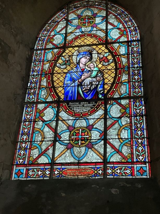 The remarkable stained glass windows with several tell the lives of the saints, including that of Saint Pierre.