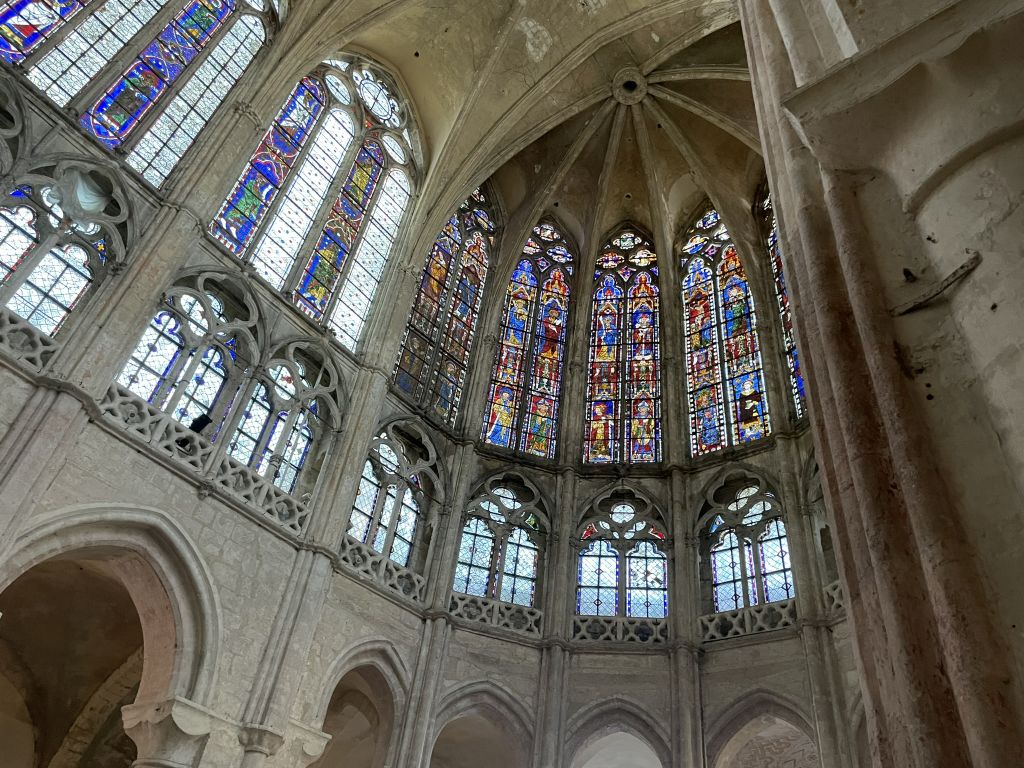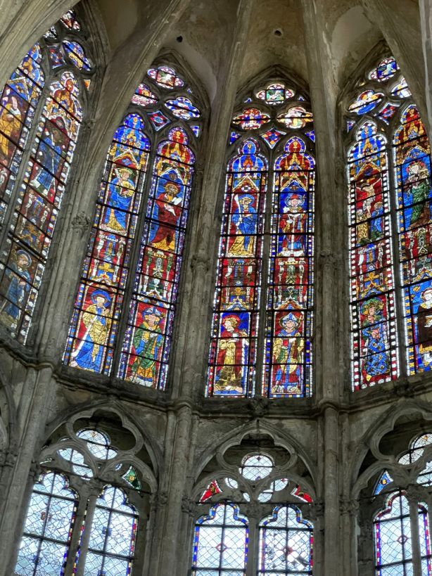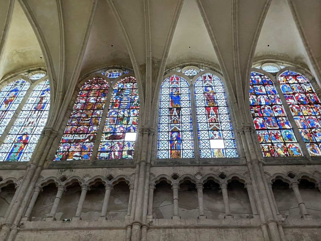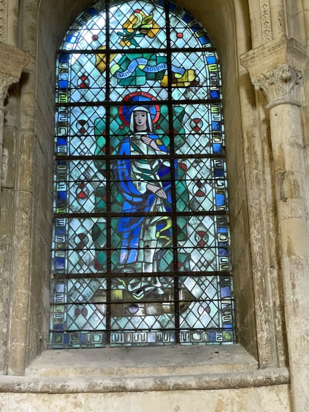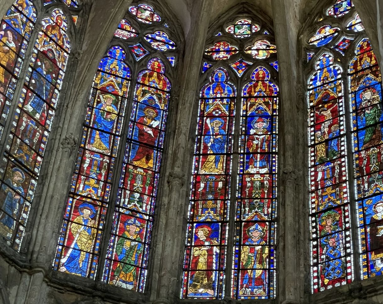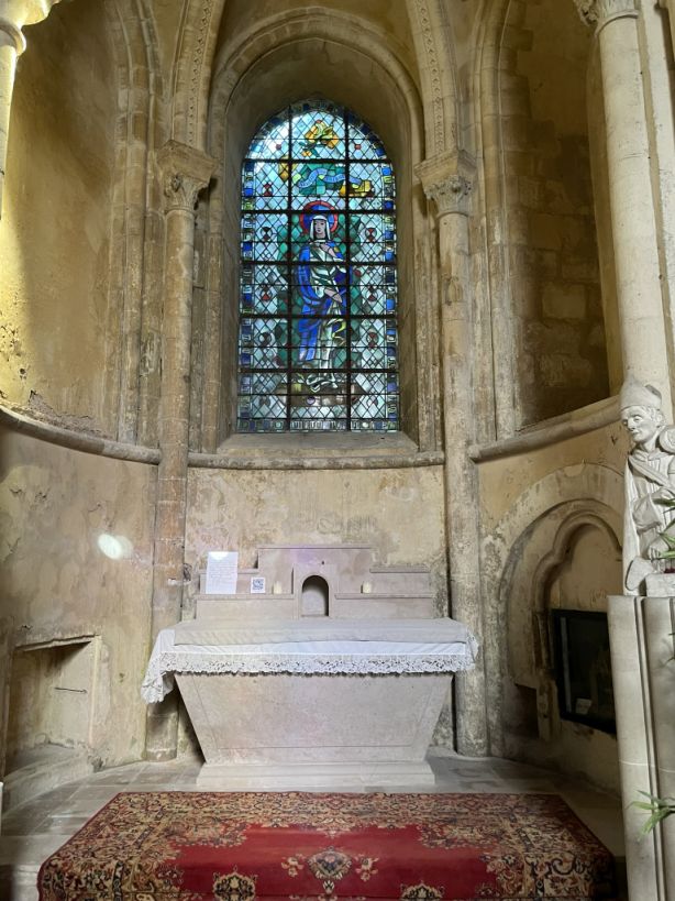 The remarkable stained glass windows with several tell the lives of the saints, including that of Saint Pierre.