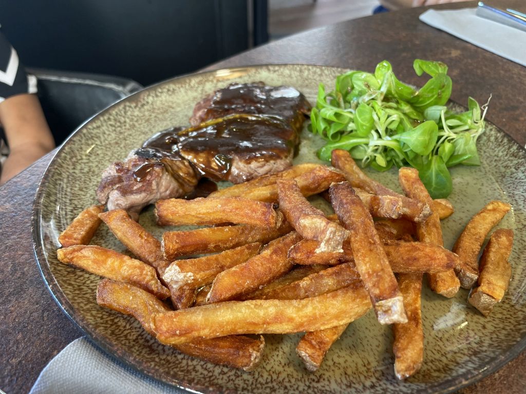 Grilled rib eye steak, demi glace sauce, served with French fries