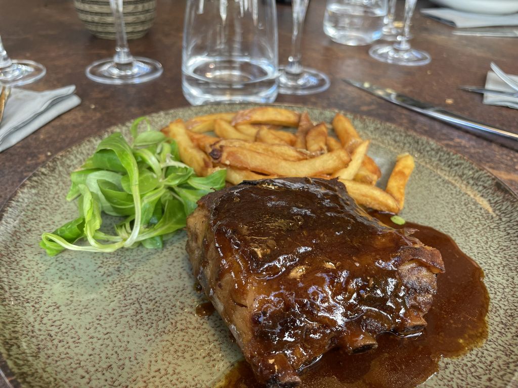 BBQ pork ribs with red wine sauce served with French fries.