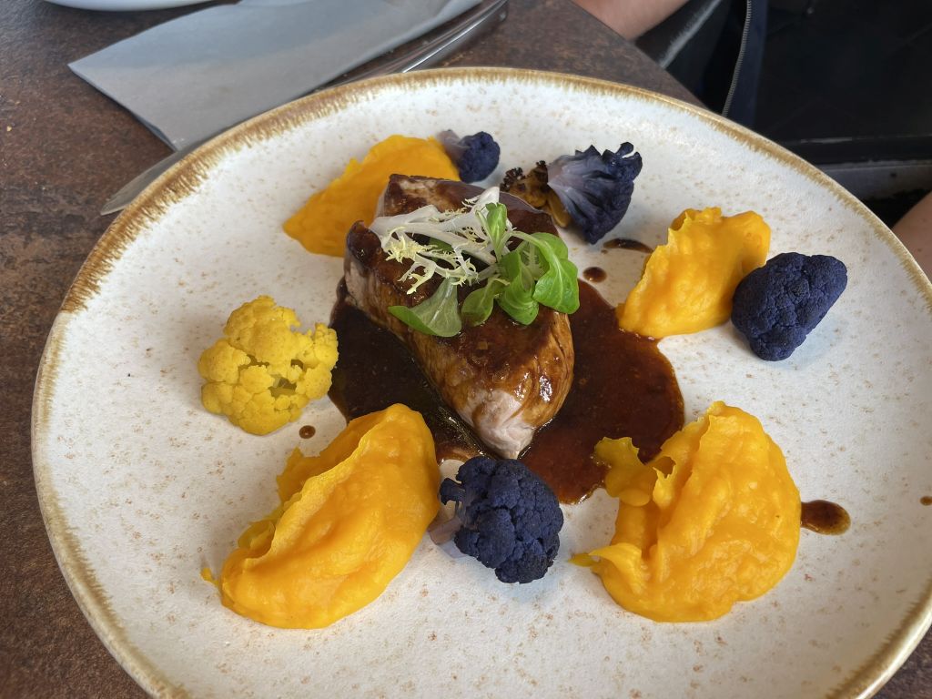 Braised pork chopped with mashed sweet potatoes and cauliflowers.
