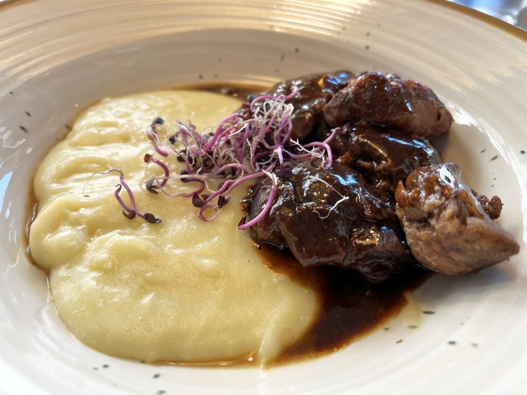 Braised iberico pork cheeks with mashed potatoes.