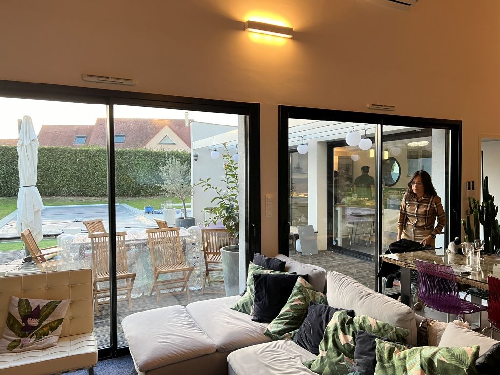 The living room with a view of the swimming pool.