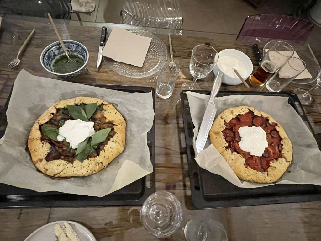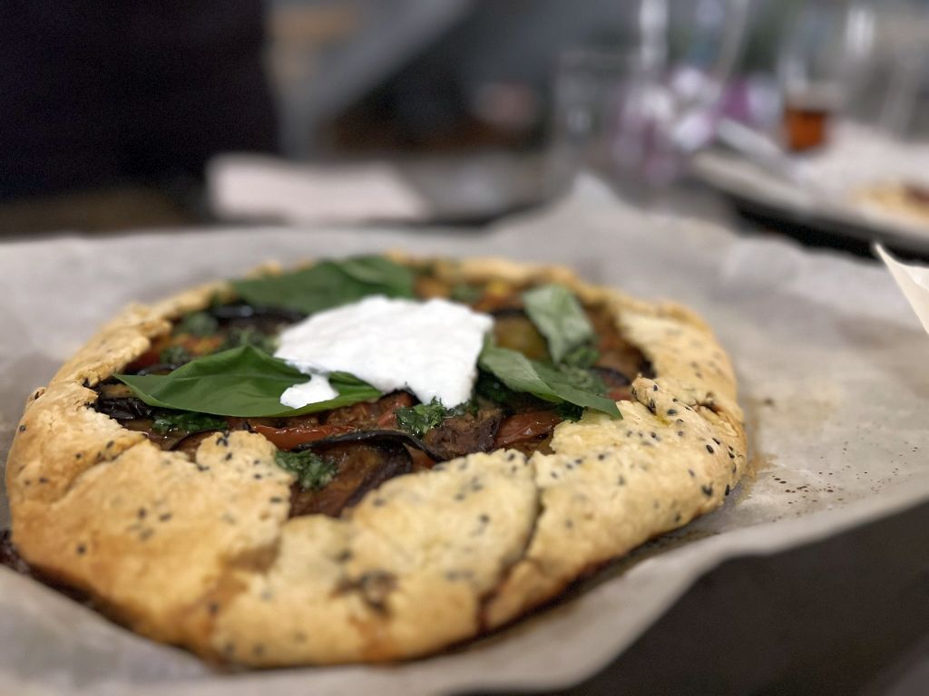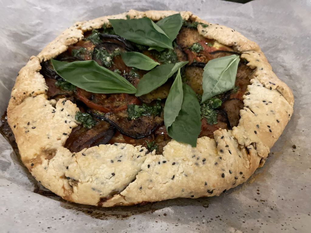 Lea make a galette with tomatoes, eggplant, and basil.