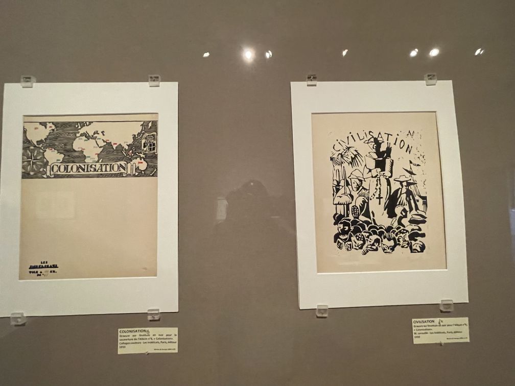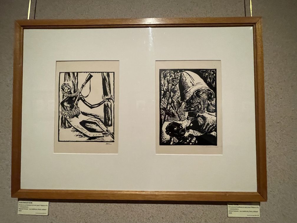 Linoleum print in black about colonization.