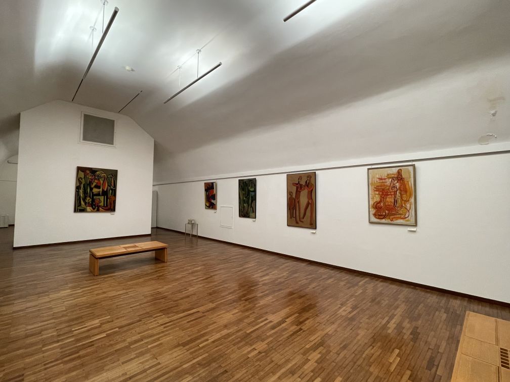 Large room surrounded by paintings.