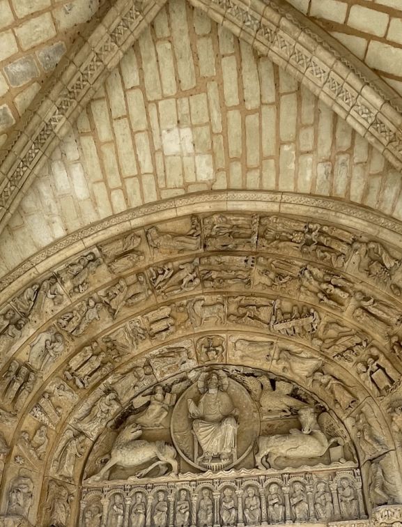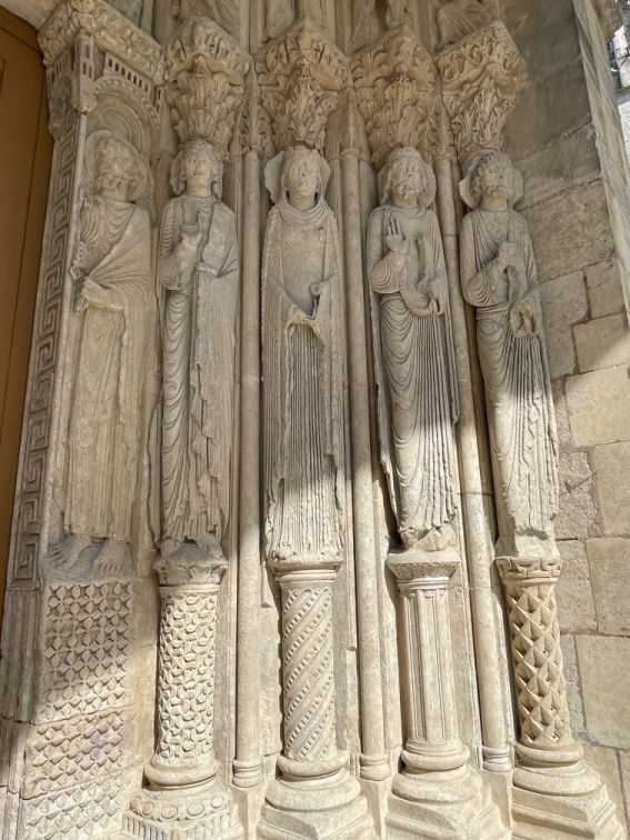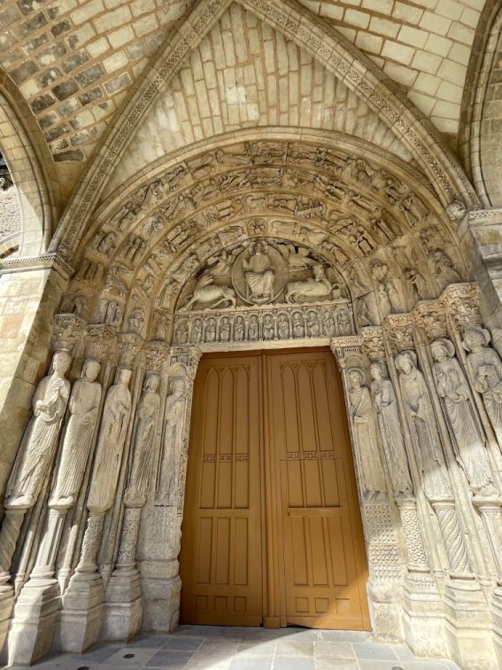 Stylistically and in its overall design, this portal is closely related to the Portail Royale at Chartres Cathedral and the west facade at the Abbey Church of St Denis, which it is roughly contemporary. The doorposts feature St Peter and St Paul (as at Moissac), flanked by eight Old Testament figures on the jamb columns, carved in the hieratic Early Gothic style found at Laon, Chartres (west facade) and in the south portal at Bourges. The archivolts are carved with scenes from the Life of Christ, some of which are squeezed rather awkwardly into the cut-down voussoirs, suggesting they may have originally been intended for a different doorway, or else that the design was changed during construction.