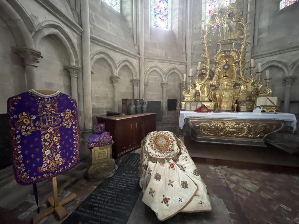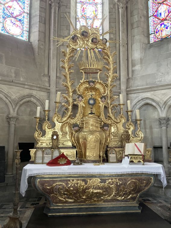 Altarpiece is adorned with its cannons (liturgy texts), a chalice and its paten, cruets and a missal.