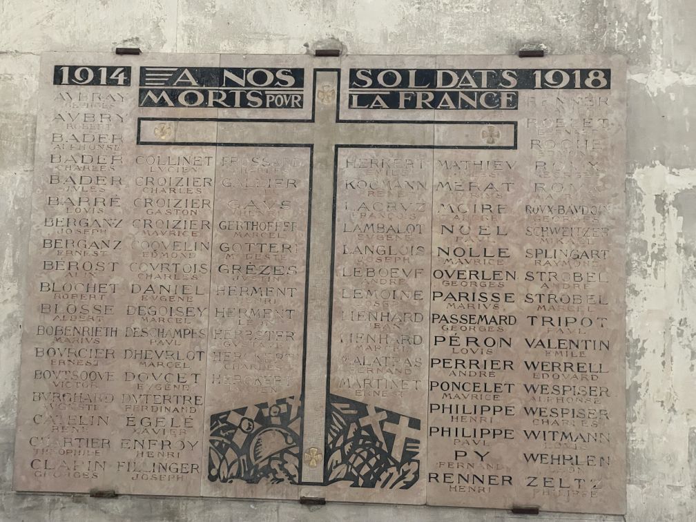 On the wall is a marble plaque dedicated to soldiers that died during the great war.