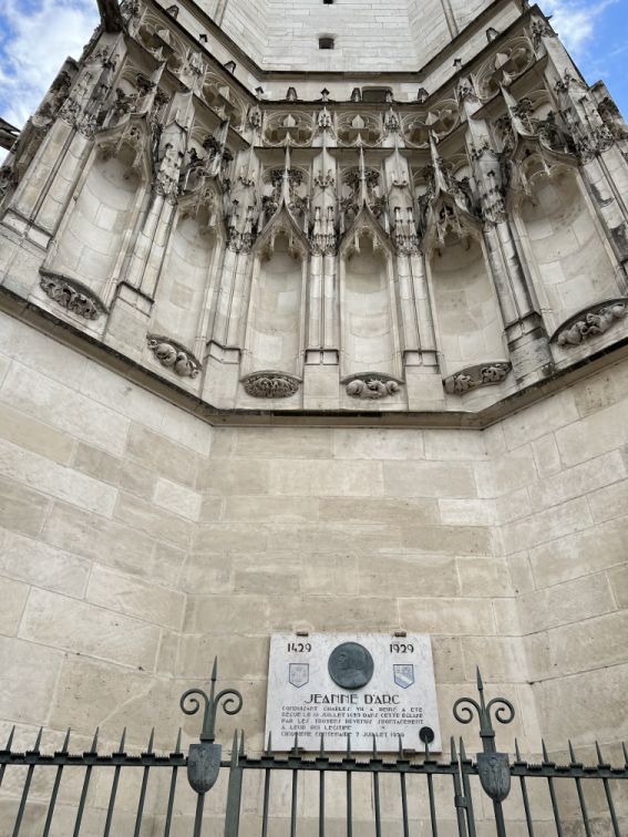 A 20th-century inscription at the base of the tower records that In July 1429, Joan of Arc escorted the Dauphin to Mass in the cathedral en route to proclaiming him Charles VII of France at Reims Cathedral, in contravention of the recently signed Treaty of Troyes.