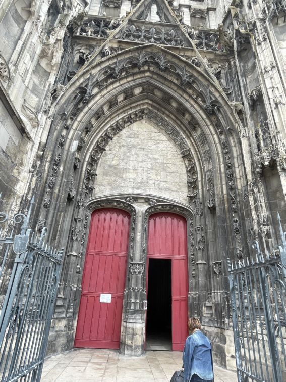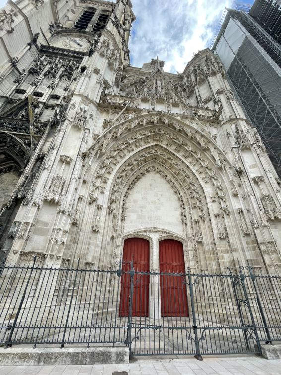The west front of the cathedral, with the three portals which serve as main entrances, was almost entirely redone beginning in 1507 in the Flamboyant style by master builder Martin Chambiges.