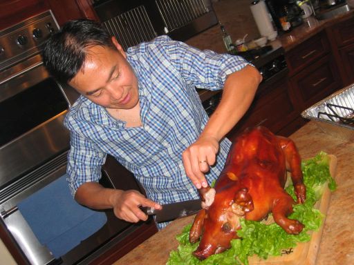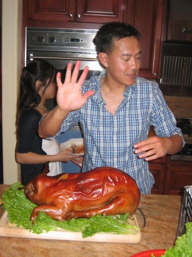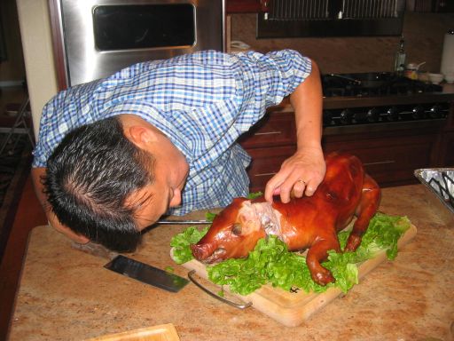 Tuan is now cutting the pig into small pieces. If you watch Andrew Zimmer on the Travel Channel, there is one episode when he was in China, Andrew ordered a whole roasted suckling pig and he mentioned that there are 2 best part in the Suckling pig: