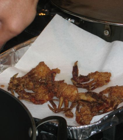 The soft-shelled crab is coated with bread crumbs and then fried. |