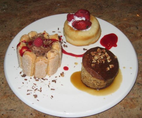 For desserts I make a chocolate Charlotte (far left), a Savarin filled with whipped cream and macerated strawberries and the yummy toffee sticky pudding cake to die for! |