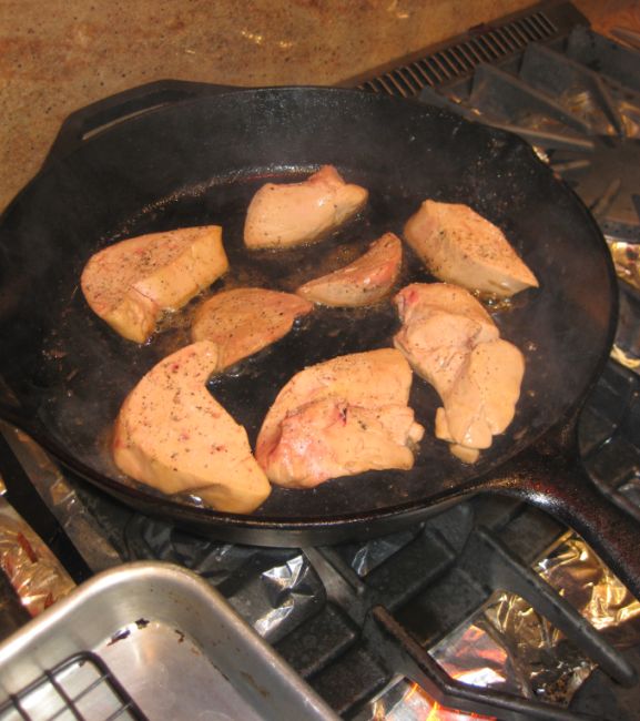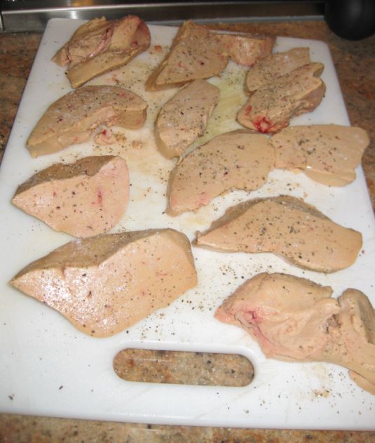 Raw foie gras cut up in pieces and sprinkle with salt and pepper |