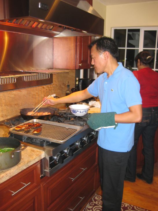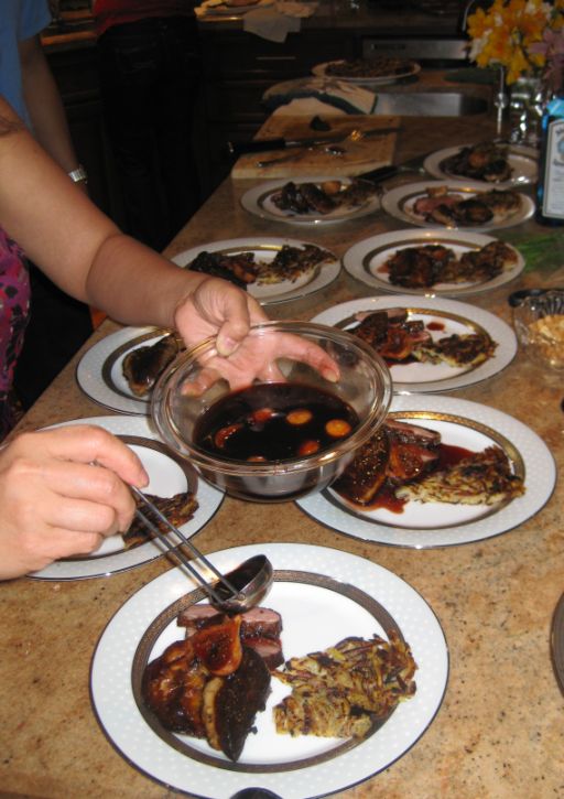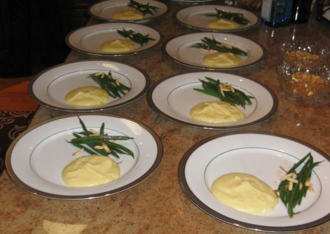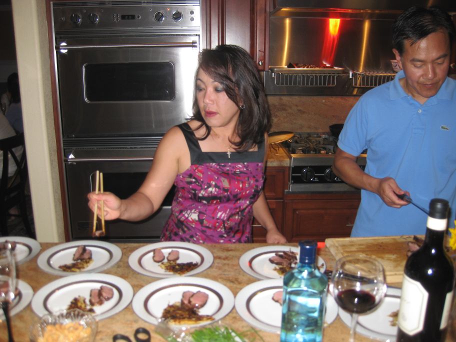 Hanh is lining up the plates and spooning the mashed potatoes and sautéed green beans into the plates while Tuan is grilling the Kobe beef outdoor. |