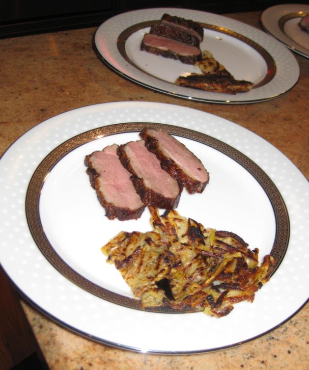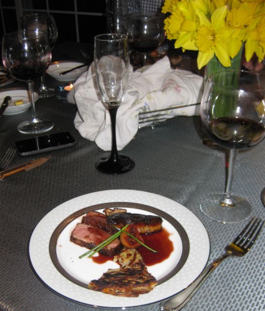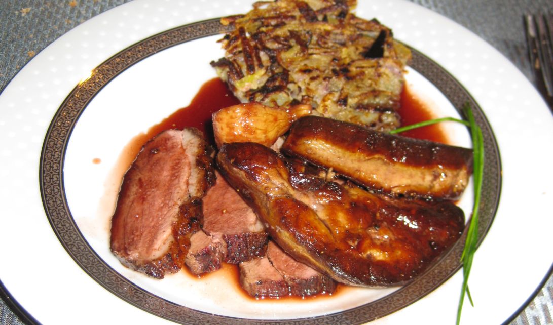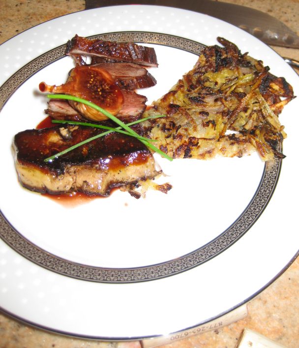 The 2nd course is Pan seared foie gras with pan seared duck's breast in a balsamic reduction with figs served with potato cakes.