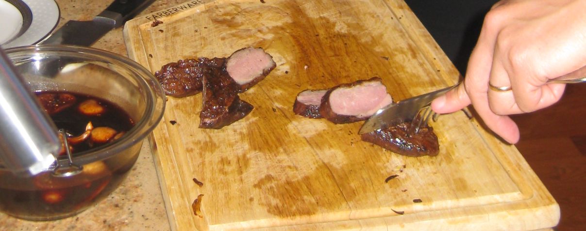 Next, the duck's breast is seared and then cut into pieces. On the left you can see the balsamic reduction with figs sauce.