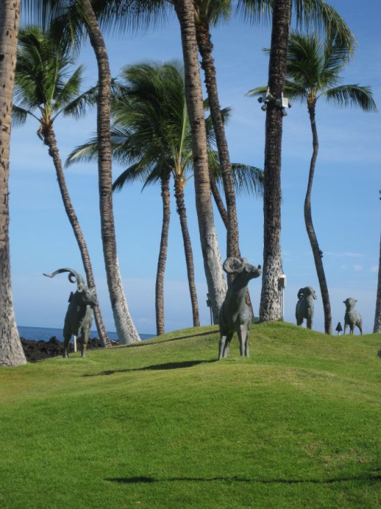 Sculptures of goats strategically placed amongst tall coconut trees.