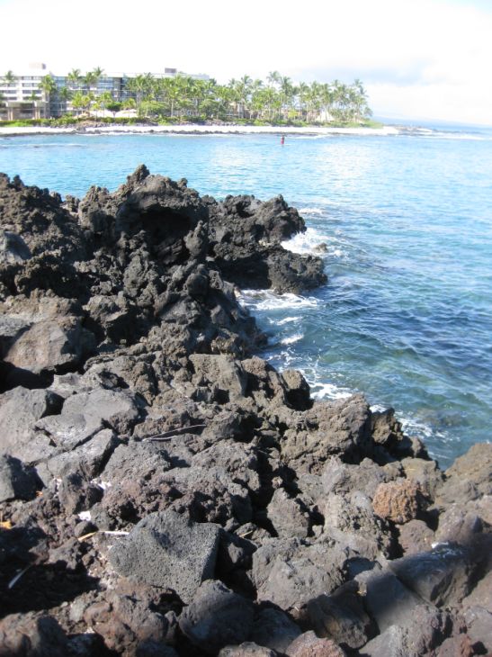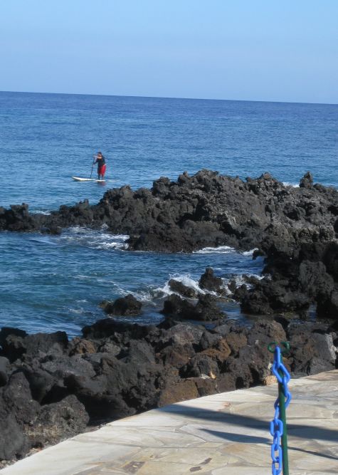 A guy paddling in the distance.. No sandy beach...just lava rocks. |