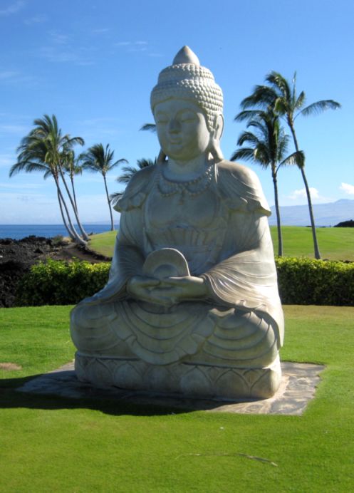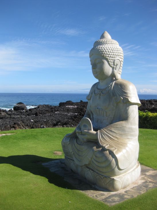Large statue of Buddha sitting majestically over looking the Ocean.