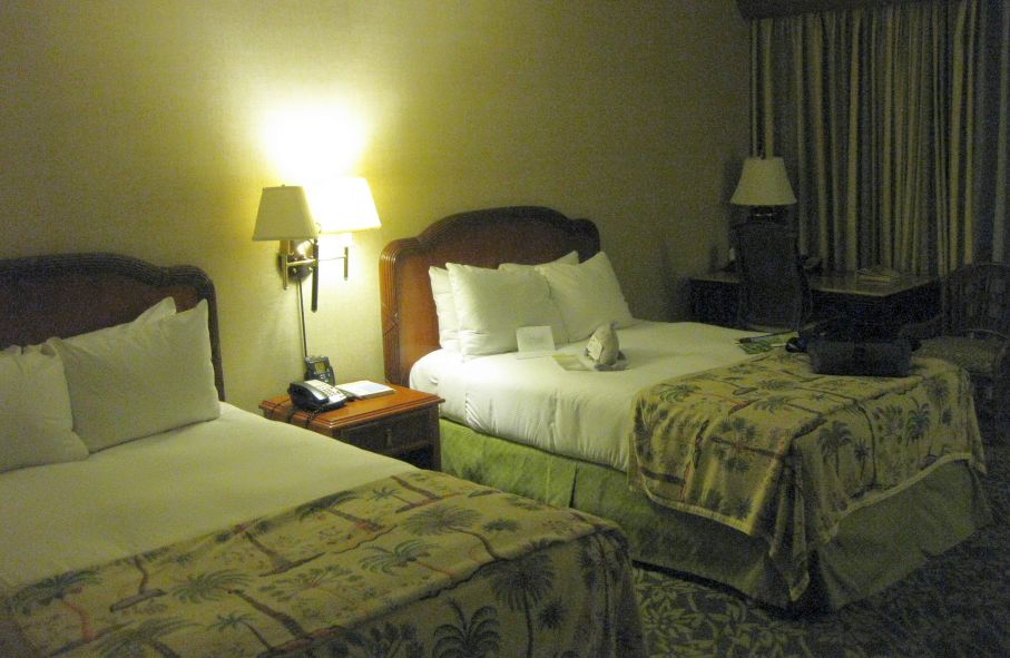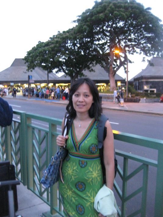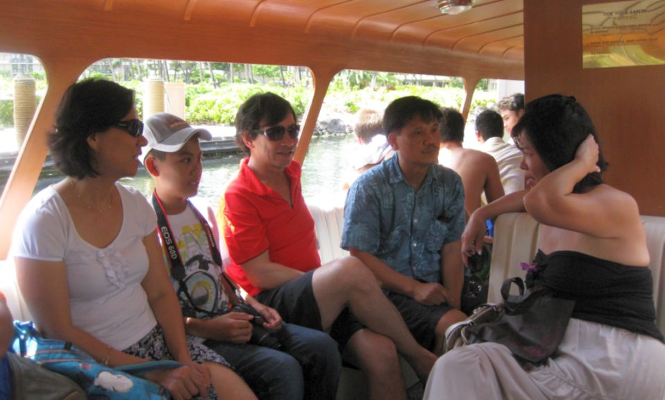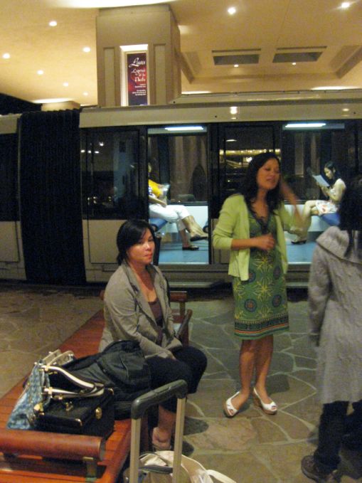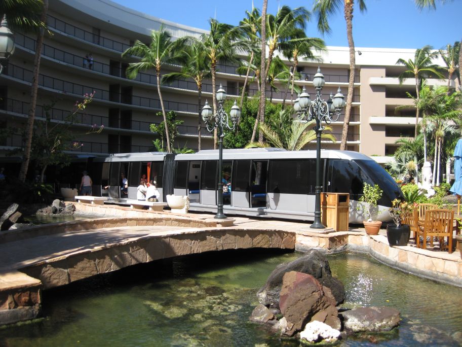 We arrived at the Hilton Waikoloa resort. We met up with Maily, Chi Phung and her daughter. Here we are waiting for the tram to take us to our room. The tram ride is about 10 minutes to our rooms. We could also walk but since it was already dark and we did not know where we were going it is wiser to take the tram and get off at the last station where our rooms are. |