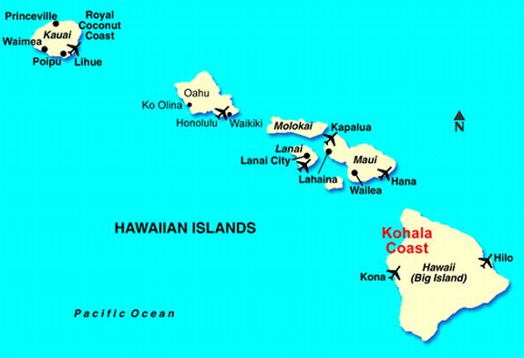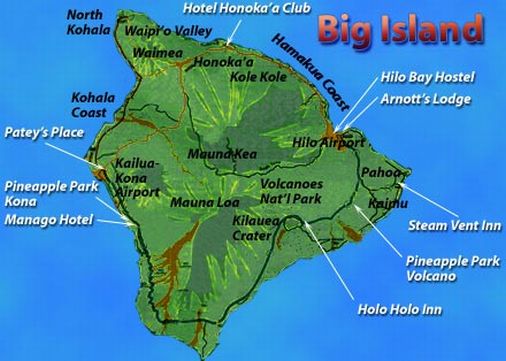 Map of the Big Island. Our hotel is located about 20 minutes of drive from the Kona Airport (left hand side ) |