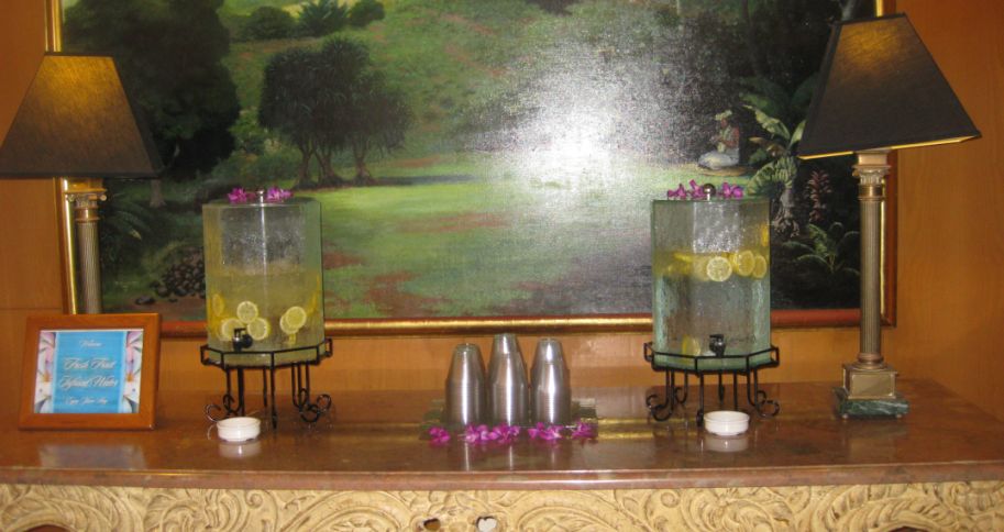 Iced water mixed with fresh lemon slices in the lobby for guests. We drank the iced water each time we came back through the lobby. The water is a really nice touch to quench our thirst.