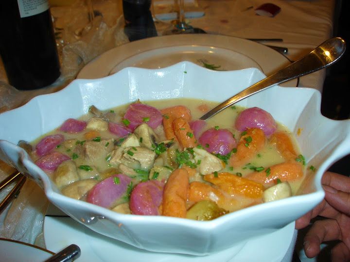 Blanquette de porc Bouchon style. A traditional blanquette should be all white but here Tomas Keller for Bouchon add glazed carrots and glazed turnips that why this dish is a lot more colorful than a traditional blanquette.