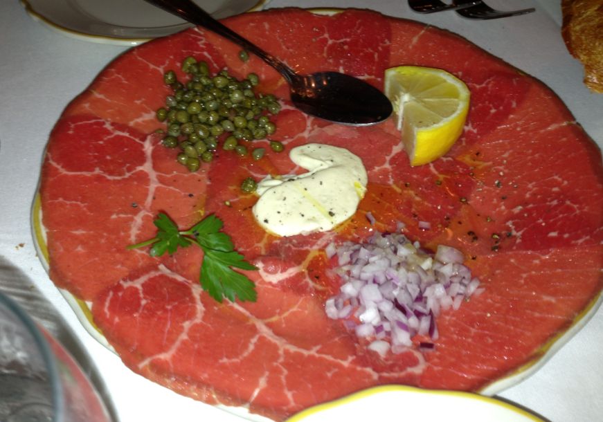 Beef Carpaccio, thin slices of raw steak, onion, caper, lemon and mustard