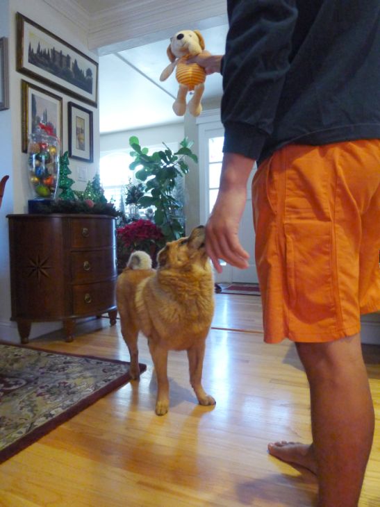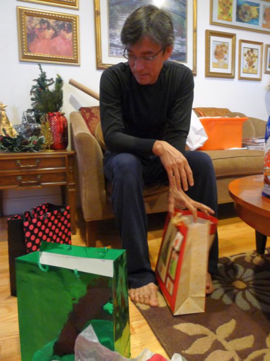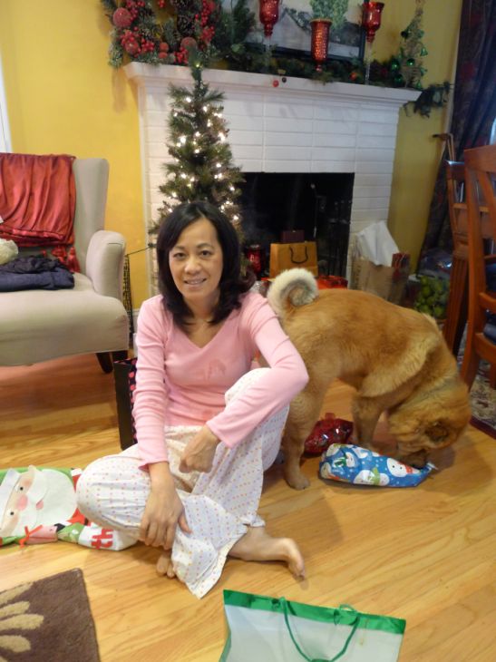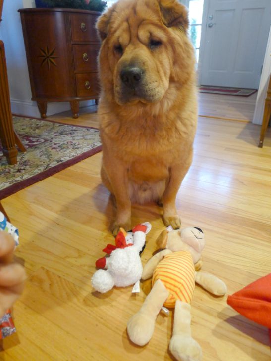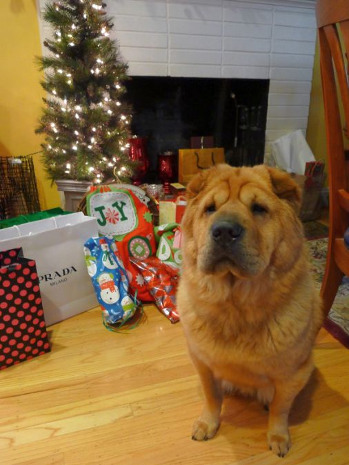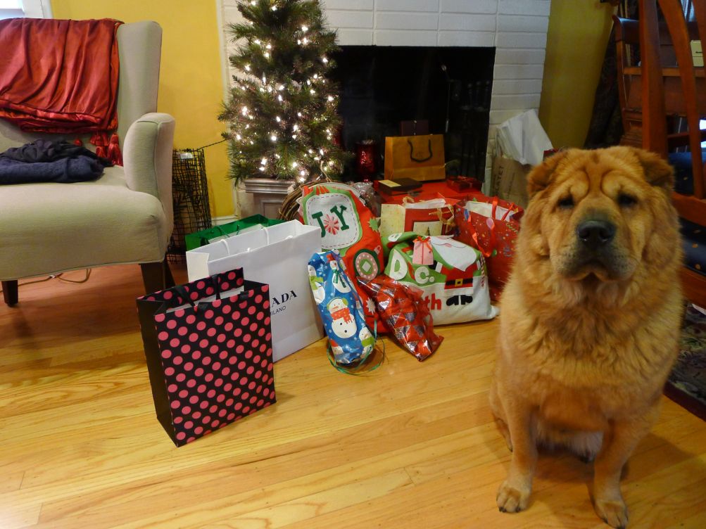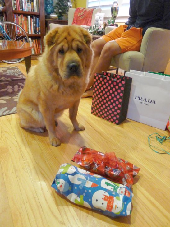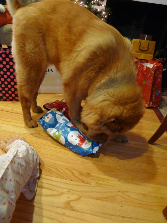Rocky and his presents.... I put a treat inside the package that's why Rocky is sniffing it.